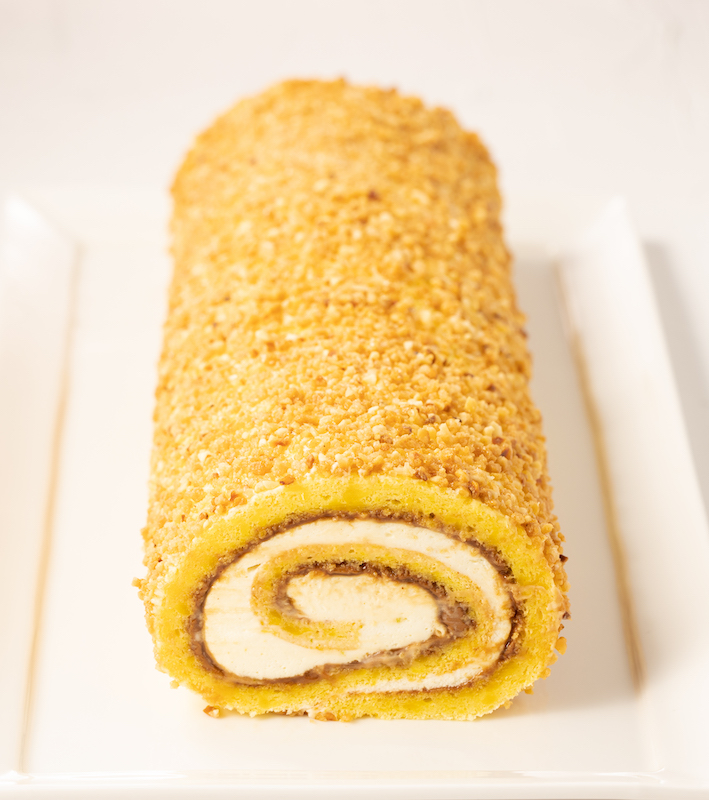 Deze feestelijke biscuitrol van Cyril Lignac is gemaakt van Japanse biscuit, afgewerkt met een vulling van citroenganache en praliné. Hier in een vereenvoudigde versie.